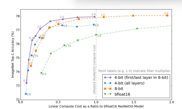In another experiment from ‘Pareto-Optimal Quantized ResNet Is Mostly 4-bit’ (Abdolrashidi, 2021), the authors study the impact of different quantization precisions on a bfloat16 ResNet50 baseline model. The experiment reveals that the 4-bit and 8-bit models, though more heavily quantized than the baseline model, outperform the bfloat16 model in terms of accuracy. To put it more precisely, the best compute cost-accuracy Pareto curve is found in 4-bit models with the first and last layers quantized to 8-bits(purple curve). This result negates the traditional thought that more compression simply equates to forfeiting more accuracy. It is valuable to acknowledge that in this context and also in many others, the more heavily quantized model is often more advantageous and optimal as it achieves lower compute costs while having innocuous effects on accuracy.