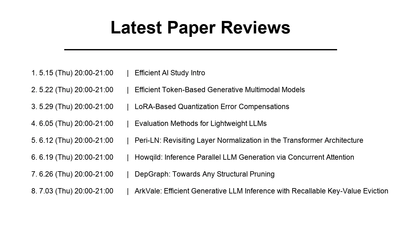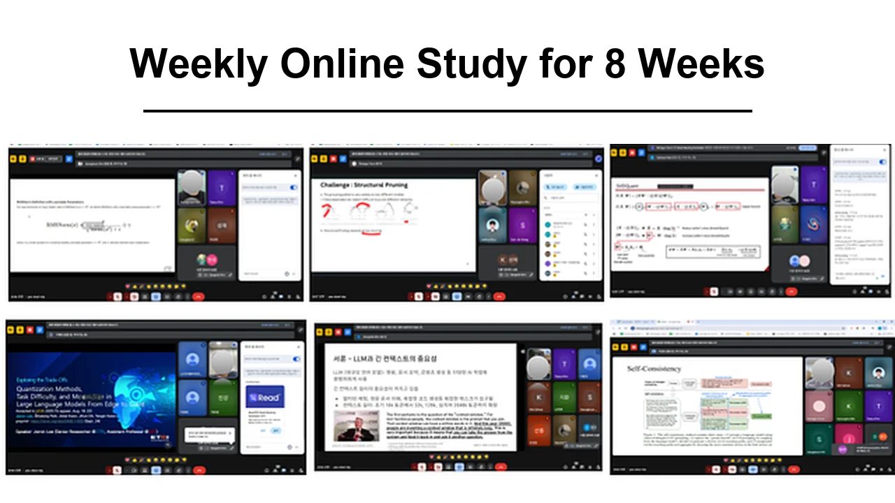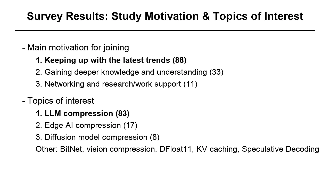 The Efficient AI Study reached its sixth edition this year and ran every Thursday at 8 p.m. for two months. Even though the sessions took place late in the evening after work, more than 170 people joined us from many different backgrounds, from college students to office workers to industry experts. Our survey showed that the top reason for joining was keeping up with the latest trends at 49.7%, and the topic of greatest interest was large language model (LLM) compression at 46.9%.