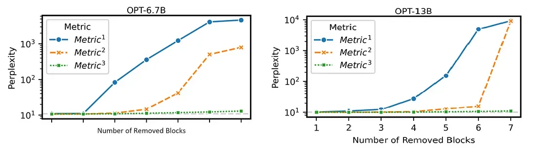 To carefully identify each block’s significance and select redundant ones for elimination, 3 metrics are presented to measure the significance and impact of each block. Out of the three, ‘Metric3’ is utilized in the SLEB algorithm since LLMs streamlined using Metric3 can maintain perplexity scores regardless of target models.
