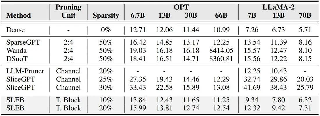 Table 1 shows OPT-66B and LLaMA-2-70B models’ perplexity results on the C4 dataset. The SLEB method not only sufficiently preserves perplexity scores for all cases, but also outperforms other pruning methods. Compared to 2:4 and channel pruning methods(Wanda, SliceGPT), the perplexity scores of the SLEB method are the lowest for OPT-66B and LLaMA-2–70B models.